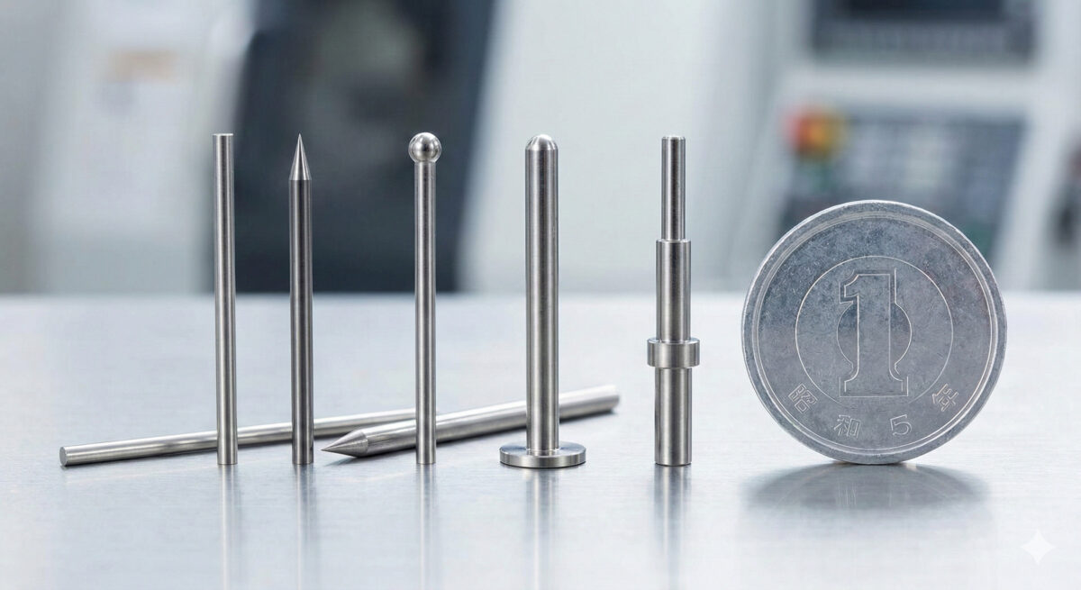 先端加工形状: 導通検査用に鋭利に尖らせた「ニードル形状」や、相手材を傷つけない「球状(R加工)」、「円錐・テーパー形状」など。